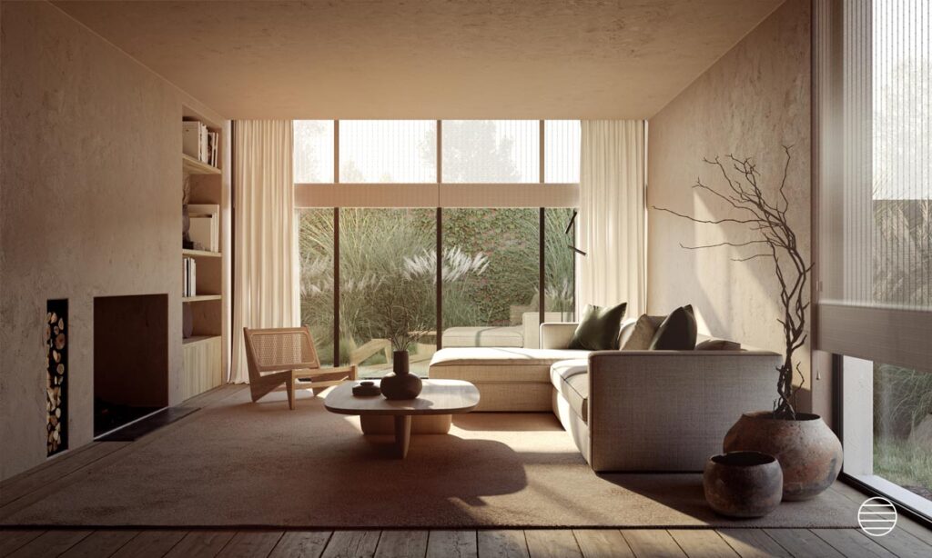Vouw- of roll-up gordijnen van geweven hout. Ze filteren het daglicht subtiel en passen prachtig bij een natuurlijke woonstijl.